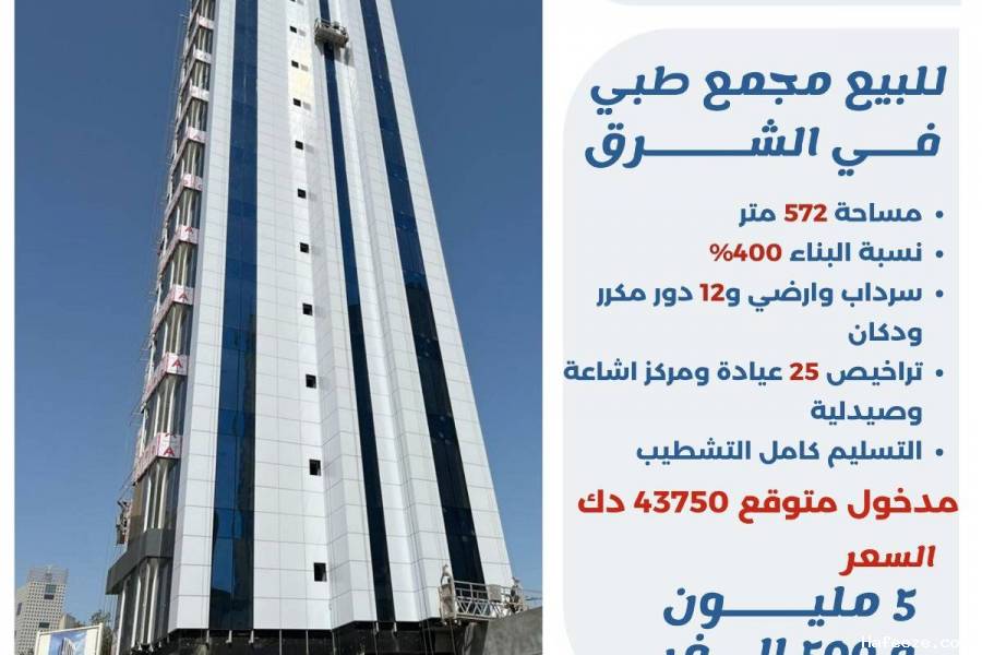 للبيع مجمع طبي في الشرق مساحة 572 متر سرداب وارضي و12 دور مكرر ودكان تراخيص 25 عيادة ومركز اشاعة وصيدلية التسليم كامل التشطيب مدخول متوقع 43750 دينار السعر 5 مليون و500 الف