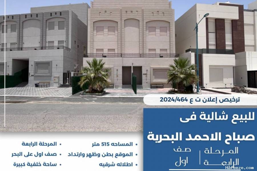 للبيع شالية في صباح الاحمد البحرية المرحلة الرابعة صف اول المساحة 515 متر الموقع بطن وظهر وارتداد صف اول على البحر اطلالة شرقية ساحة خلفية كبيرة يتكون من ثلاث ادوار امتداد بحري كبير مقسوم شالهين منفصليين السعر 430 الف