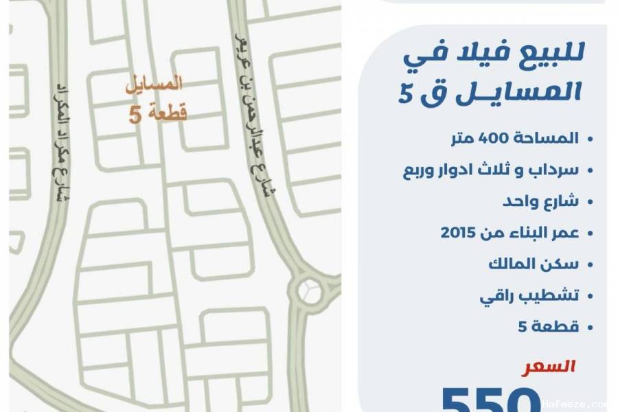 للبيع فيلا في المسايل قطّعه 5 سرداب و ثلاث ادوار وربع المساحة : 400 شارع واحد عمر البناء : 2015 سكن المالك تشطيب راقي السعر 550 الف