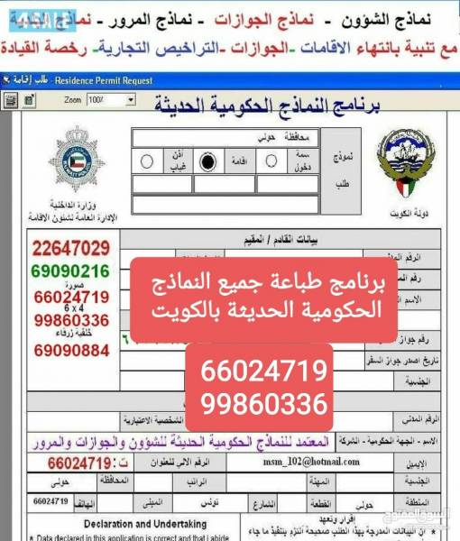 برنامج طباعة جميع النماذج الحكومية الكويتية الحديثة لمكاتب الطباعة والتصوير وللافراد والشركات والمؤسسات برنامج المعتمد لطباعة جميع النماذج الحكومية الحديثة بالكويت هو البرنامج الاول والافضل والاصلى والمنتشر بالكويت بشهادة الاف الشركات والمحلات التى تستخدمة منذ سنوات وبدون اى اشتركات او رسوم سنوية مع تحديث دائم للنماذج بالبرنامج مع طباعة جميع النماذج الحكومية الحديثة للشؤون والجوازات والمرور والتجارة والبلدية والجمارك وعقود العمل للموظفين واستلام المستحقات وانهاء الخدمات واقرارات وتعهدات ونماذج اخرى كثيرة مع تنبيه بانتهاء الاقامات والجوازات والتراخيص التجارية للشركة ونتبيهات اخرى كثيرة عن الموظفين والشركة وارشيف الوثائق للموظفين والشركة
