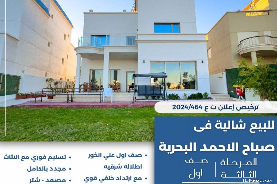 للبيع شالية في صباح الاحمد البحرية المرحلة الثالة صف اول علي الخور تسليم فوري مع الاثاث اطلالة شرقية مجدد بالكامل مع ارتداد خلفي مصعد شتر دورين وربع سخان مركزي فلتر مركزي السعر 440 الف