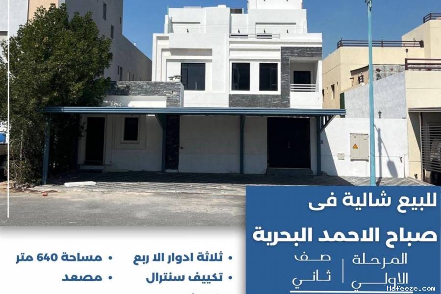 للبيع شاليه في صباح الاحمد البحرية المرحلة الاولى صف ثاني السعر مناسب ثلاثة ادوار الا ربع مساحة 640 متر تكييف سنترال مصعد درجين