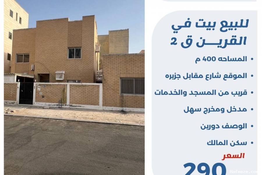 للبيع بيت حكومي في القرين المساحه 400 م الموقع شارع مقابل جزيره قريب من المسجد و مدخل ومخرج سهل الوصف دورين سكن بالبحر 290 الف
