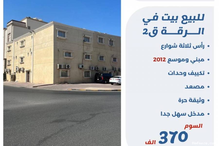 للبيع بيت في الرقه راس 3 شوارع 400 متر مبني وموسع 2008م تكيف وحدات مصعد وثيقه حره مدخل سهل جدا السوم 370 الف
