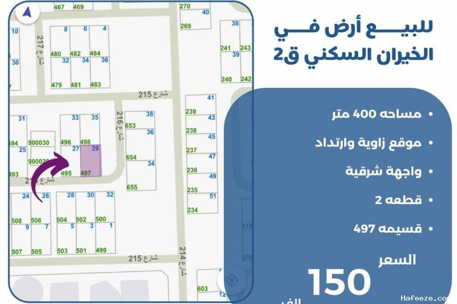 للبيع ارض في الخيران السكني قطعة 2 مساحة 400 متر موقع زاوية وارتداد واجهه شرقية قطعة 2 قسيمة 497 السعر 150 الف