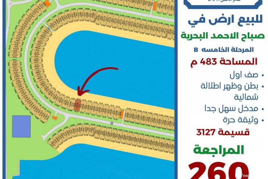 للبيع ارض في صباح الاحمد البحريه المرحله الخامسه B مساحه 483 م صف اول بطن وظهر اطلاله شماليه مدخل سهل جدا وثيقه حره قسيمه 3127 السعر 260 الف