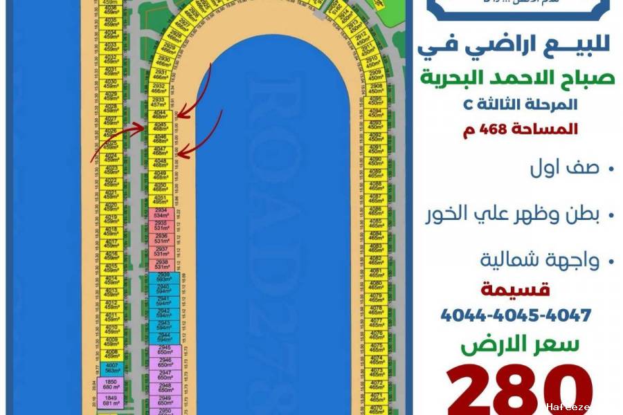 للبيع ارض في صباح الاحمد البحرية المرحلة الثالثه المساحة 468 متر صف اول بطن وظهر على الخور واجهه شمالية قسيمة 4044 و 4045 و 4047 سعر الارض 280 الف