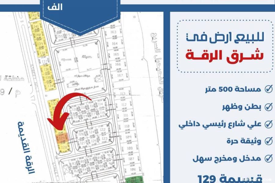 للبيع ارض في شرق الرقة مساحة 500 متر بطن وظهر علي شارع رئيسي مدخل ومخرج سهل وثيقة حرة قسيمة 129 السعر 385 الف