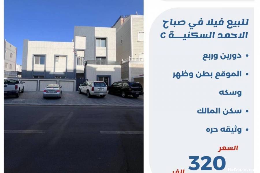للبيع فيلا في صباح الاحمد السكني c الموقع بطن وظهر وسكه تتكون من دورين وربع وثيقة حرة سكن المالك السعر 320 الف